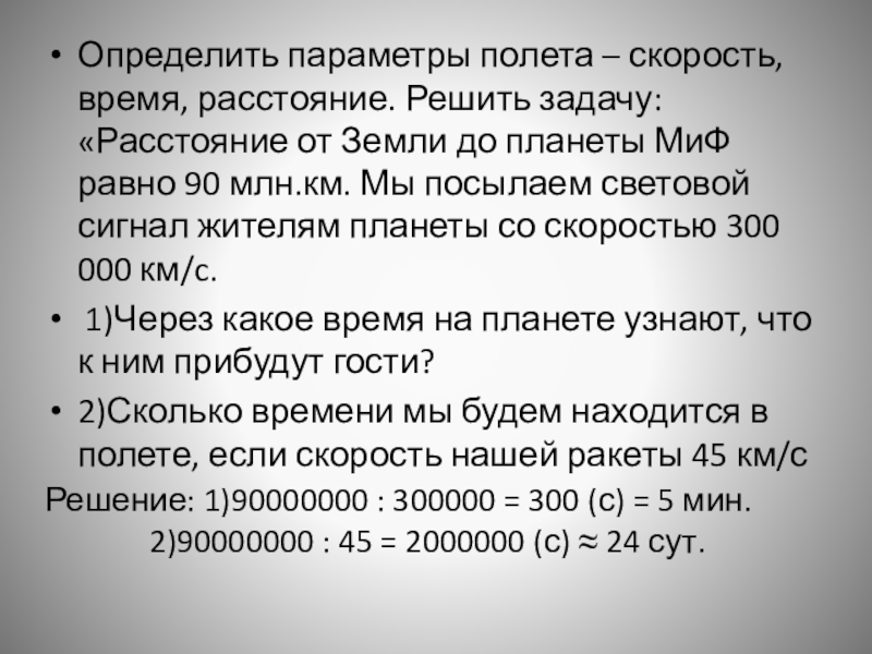 Определить параметры полета – скорость, время, расстояние. Решить задачу: «Расстояние от Земли до планеты МиФ равно 90 млн.км. Мы посылаем световой сигнал жителям планеты со скоростью 300 000 км/c.