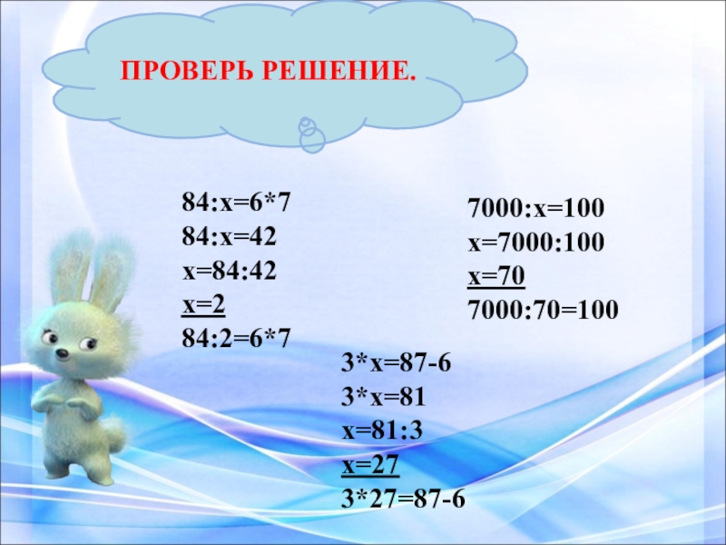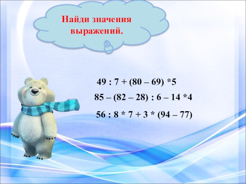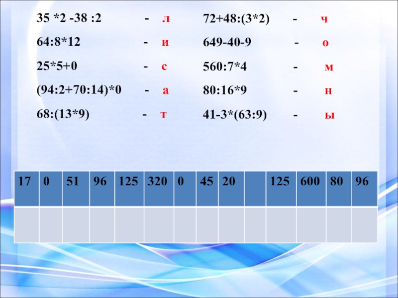 56 : 8 * 7 + 3 * (94 – 77)=100