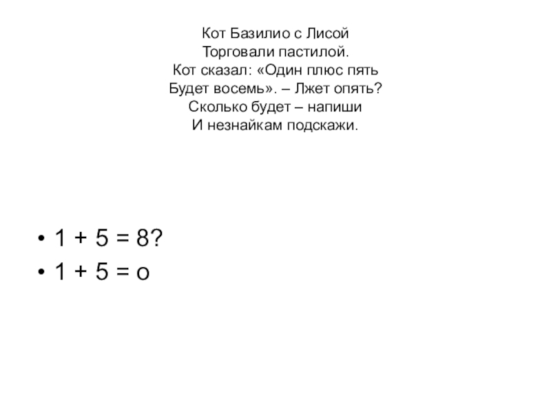 Слайд 3 Кот Базилио с Лисой Торговали пастилой. Кот сказал: «Один плюс пять Будет восемь». –