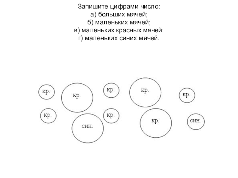 Слайд 2Запишите цифрами число: а) больших мячей; б) маленьких мячей; в) маленьких красных мячей; г) маленьких