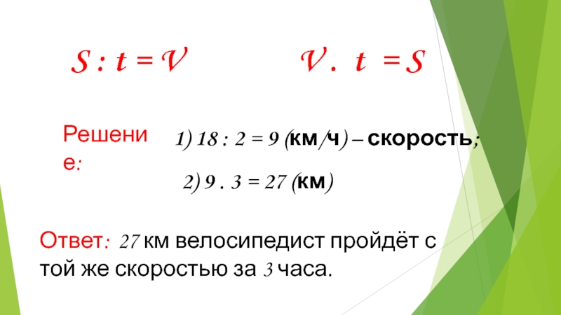 Ответ: 27 км велосипедист пройдёт с той же скоростью за 3 часа.
