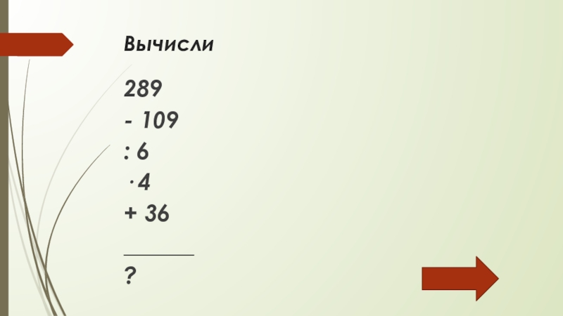 Вычисли 289- 109: 6· 4+ 36______?