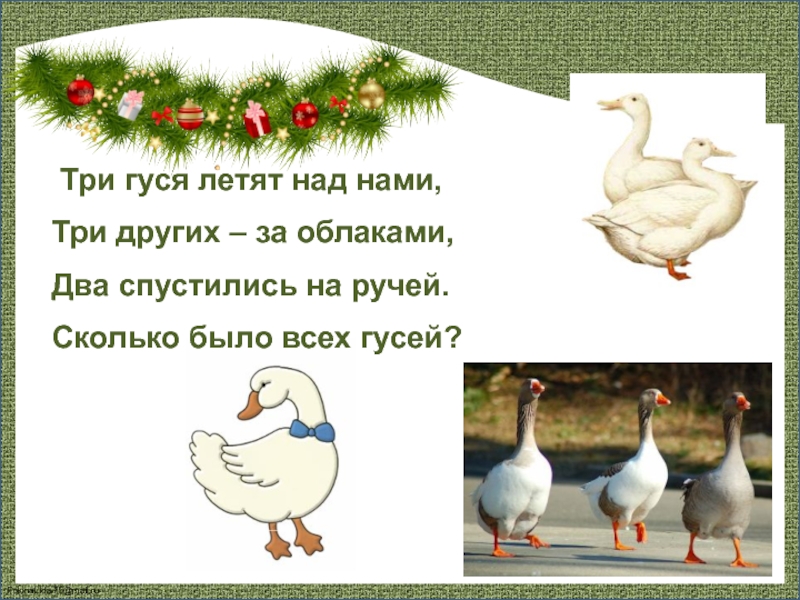 Три гуся летят над нами,Три других – за облаками,Два спустились на ручей.Сколько было всех гусей?