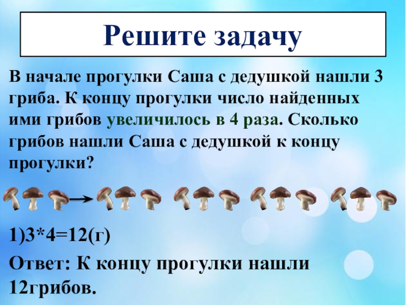 Ответ: К концу прогулки нашли 12грибов.
