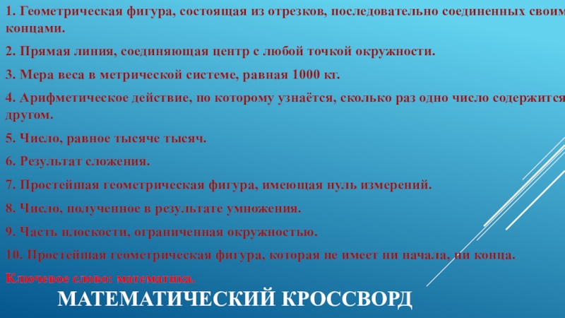10. Простейшая геометрическая фигура, которая не имеет ни начала, ни конца.