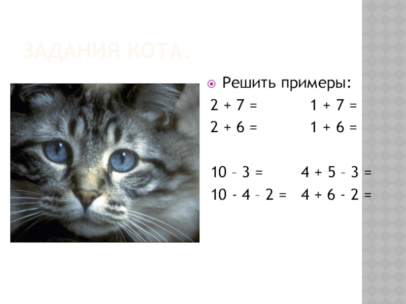 ЗАДАНИЯ КОТА.Решить примеры:2 + 7 =      1 + 7 =2 + 6