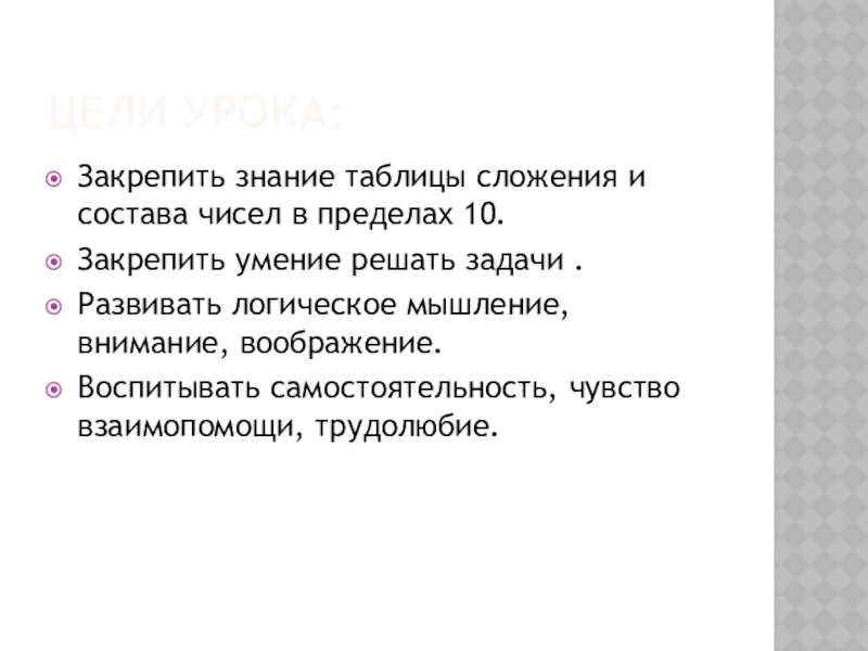 Закрепить знание таблицы сложения и состава чисел в пределах 10.