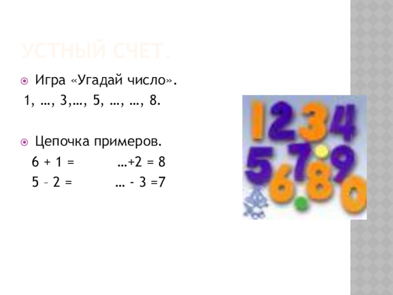 УСТНЫЙ СЧЕТ.Игра «Угадай число».1, …, 3,…, 5, …, …, 8.Цепочка примеров. 6 + 1 =