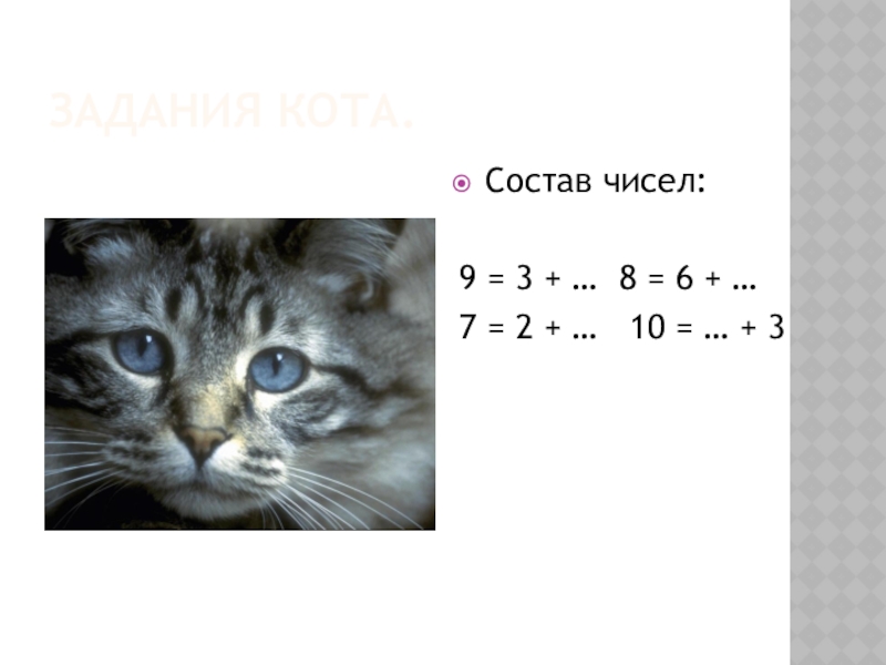 ЗАДАНИЯ КОТА.Состав чисел:9 = 3 + … 8 = 6 + …7 = 2 + …