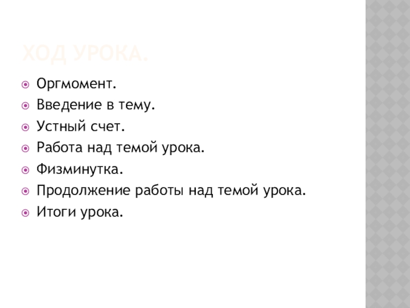 ХОД УРОКА.Оргмомент.Введение в тему.Устный счет.Работа над темой урока.Физминутка.Продолжение работы над темой урока.Итоги урока.