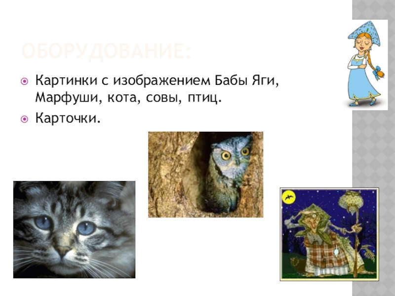 ОБОРУДОВАНИЕ:Картинки с изображением Бабы Яги, Марфуши, кота, совы, птиц.Карточки.