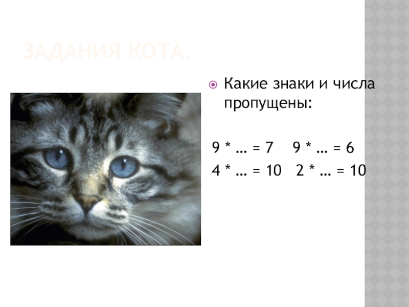ЗАДАНИЯ КОТА.Какие знаки и числа пропущены:9 * … = 7  9 * … = 64 *