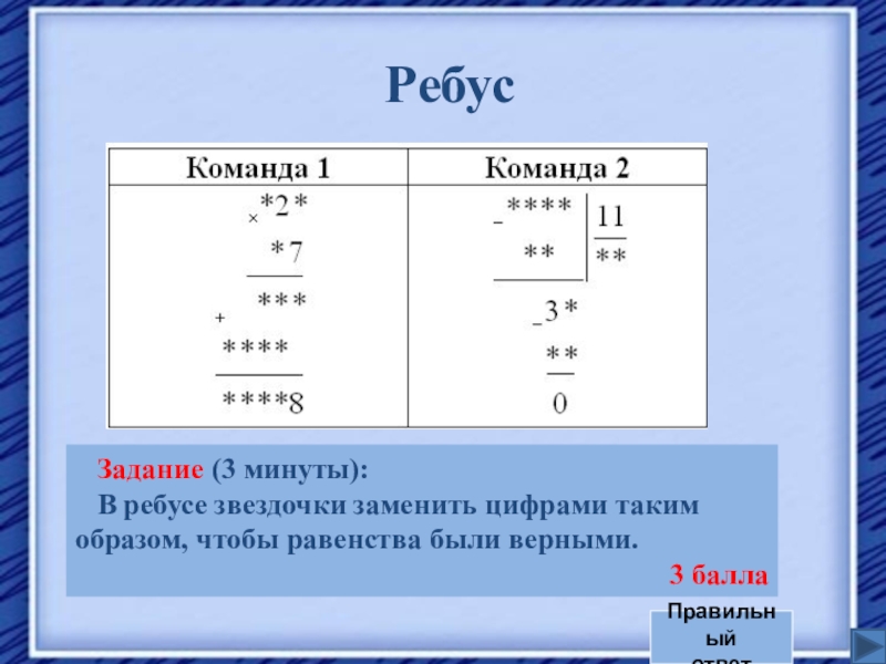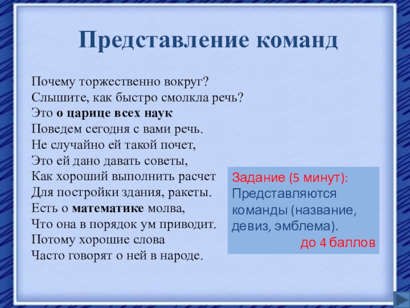 Задание (5 минут): Представляются команды (название, девиз, эмблема).