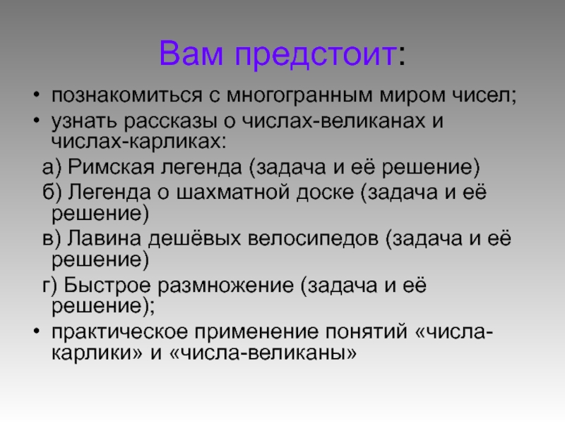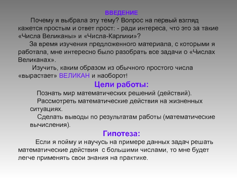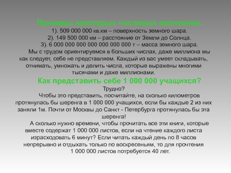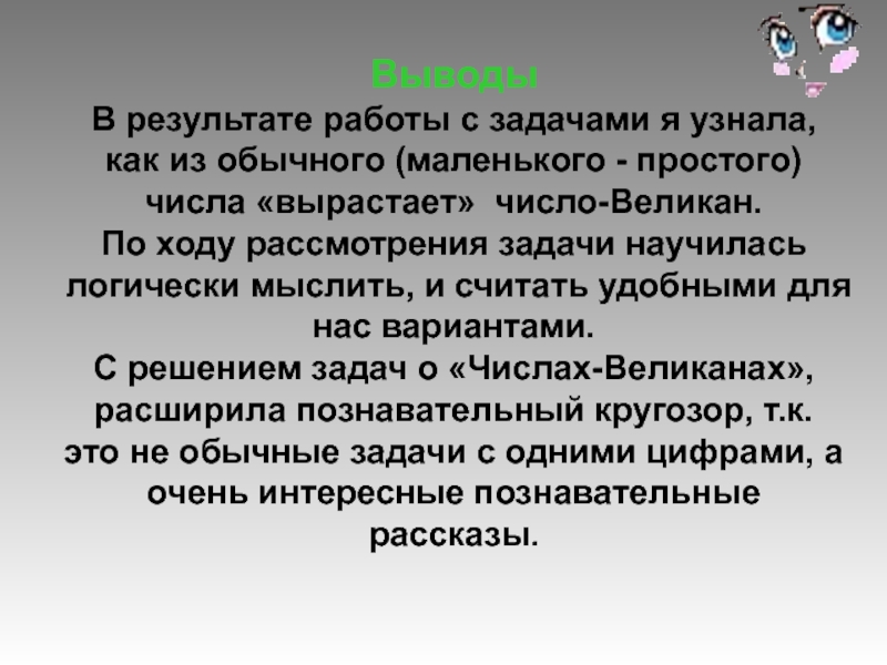 За время изучения предложенного материала, с которыми я работала, мне интересно было разобрать все задачи о «Числах Великанах».