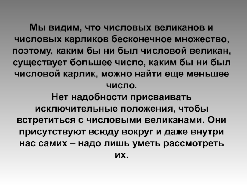 Слайд 15Мы видим, что числовых великанов и числовых карликов бесконечное множество, поэтому,