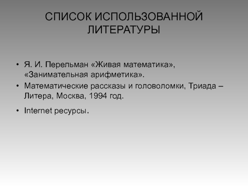 Я. И. Перельман «Живая математика», «Занимательная арифметика».