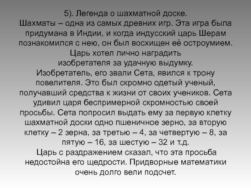 Изобретатель, его звали Сета, явился к трону повелителя. Это был скромно одетый ученый, получавший средства к жизни от своих учеников. Сета удивил царя беспримерной скромностью своей просьбы. Сета попросил выдать ему за первую клетку шахматной доски одно пшеничное зерно, за вторую клетку – 2 зерна, за третью – 4, за четвертую – 8, за пятую – 16, за шестую – 32 и т.д.
