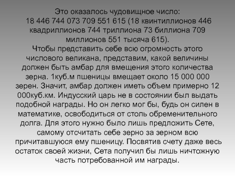 Чтобы представить себе всю огромность этого числового великана, представим, какой величины должен быть амбар для вмещения этого количества зерна. 1куб.м пшеницы вмещает около 15 000 000 зерен. Значит, амбар должен иметь объем примерно 12 000куб.км. Индусский царь не в состоянии был выдать подобной награды. Но он легко мог бы, будь он силен в математике, освободиться от столь обременительного долга. Для этого нужно было лишь предложить Сете, самому отсчитать себе зерно за зерном всю причитавшуюся ему пшеницу. Посвятив счету даже весь остаток своей жизни, Сета получил бы лишь ничтожную часть потребованной им награды.