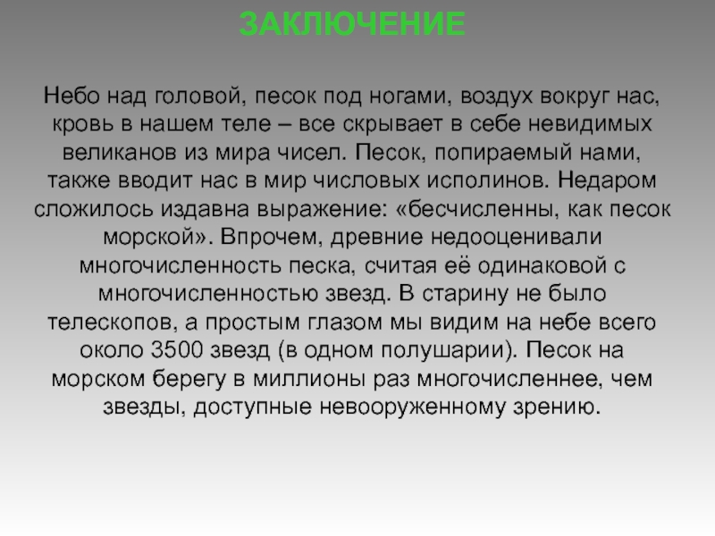 нашем теле – все скрывает в себе невидимых великанов из мира чисел. Песок, попираемый нами, также вводит нас в мир числовых исполинов. Недаром сложилось издавна выражение: «бесчисленны, как песок морской». Впрочем, древние недооценивали многочисленность песка, считая её одинаковой с многочисленностью звезд. В старину не было телескопов, а простым глазом мы видим на небе всего около 3500 звезд (в одном полушарии). Песок на морском берегу в миллионы раз многочисленнее, чем звезды, доступные невооруженному зрению.