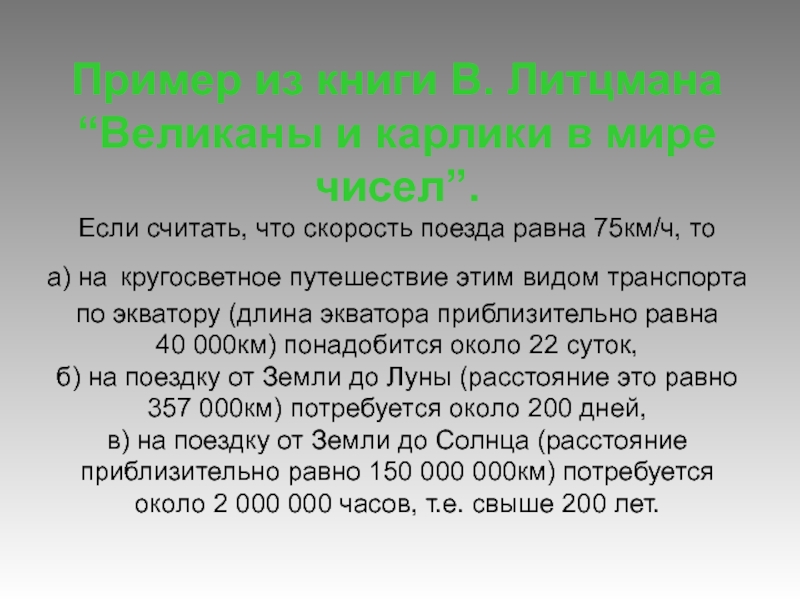 в) на поездку от Земли до Солнца (расстояние приблизительно равно 150 000 000км) потребуется около 2 000 000 часов, т.е. свыше 200 лет.