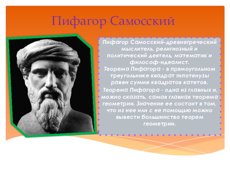 Пифагор Самосский-древнегреческий мыслитель, религиозный и политический деятель, математик и философ-идеалист.