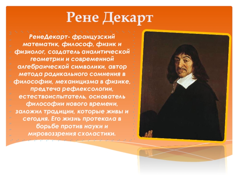 и современной алгебраической символики, автор метода радикального сомнения в философии, механицизма в физике, предтеча рефлексологии, естествоиспытатель, основатель философии нового времени, заложил традиции, которые живы и сегодня. Его жизнь протекала в борьбе против науки и мировоззрения схоластики.