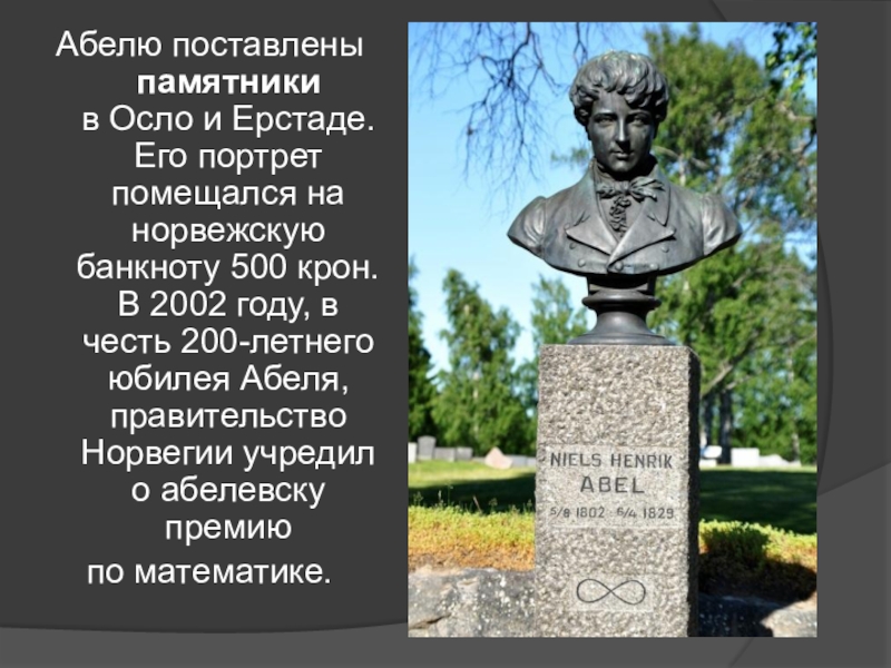 Слайд 17Абелю поставлены памятники в Осло и Ерстаде. Его портрет помещался на норвежскую банкноту 500