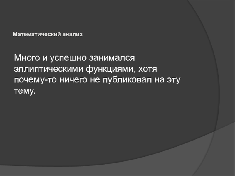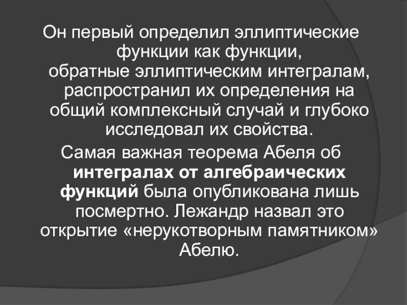Слайд 16Он первый определил эллиптические функции как функции, обратные эллиптическим интегралам, распространил их определения на