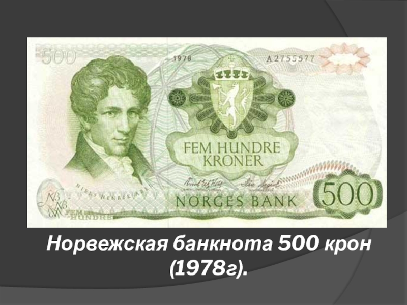 Слайд 18Норвежская банкнота 500 крон (1978г).