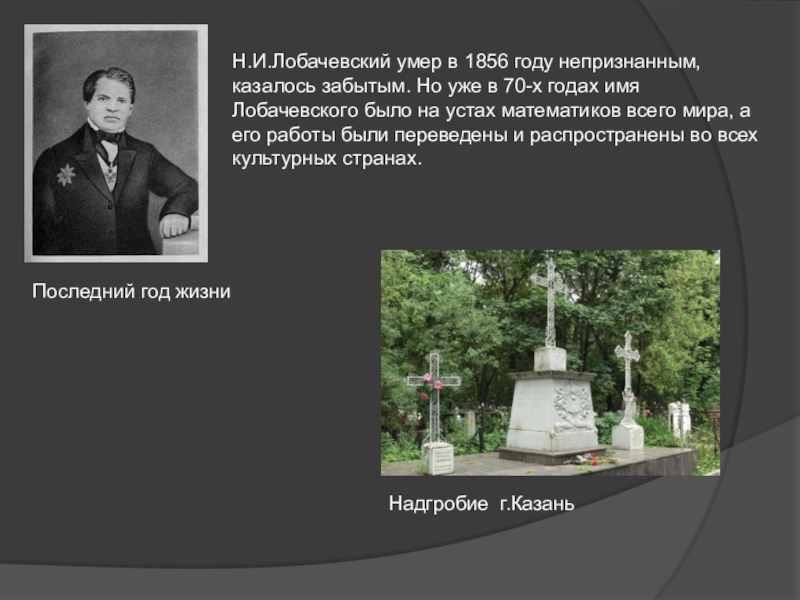 Слайд 11Н.И.Лобачевский умер в 1856 году непризнанным, казалось забытым. Но уже в
