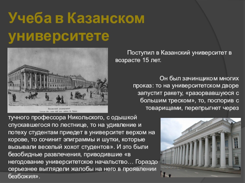 тучного профессора Никольского, с одышкой спускавшегося по лестнице, то на удивление и потеху студентам приедет в университет верхом на корове, то сочинит эпиграммы и шутки, которые вызывали веселый хохот студентов». И это были безобидные развлечения, приводившие «в негодование университетское начальство… Гораздо серьезнее выглядели жалобы на него в проявлении безбожия».