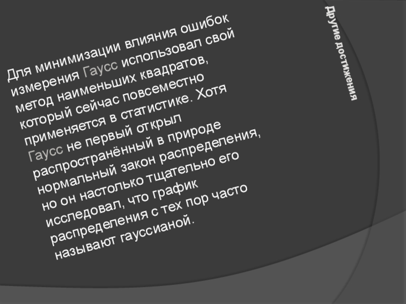 квадратов, который сейчас повсеместно применяется в статистике. Хотя Гаусс не первый открыл распространённый в природе нормальный закон распределения, но он настолько тщательно его исследовал, что график распределения с тех пор часто называют гауссианой.