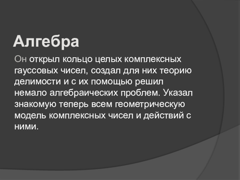 Он открыл кольцо целых комплексных гауссовых чисел, создал для них теорию
