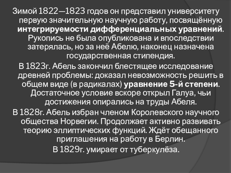 Слайд 14Зимой 1822—1823 годов он представил университету первую значительную научную работу, посвящённую интегрируемости дифференциальных