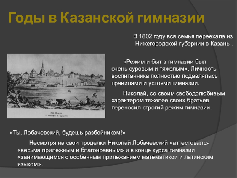 Несмотря на свои проделки Николай Лобачевский «аттестовался «весьма прилежным и благонравным» и в конце курса гимназии «занимающимся с особенным прилежанием математикой и латинским языком».