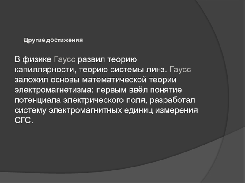 В физике Гаусс развил теорию капиллярности, теорию системы линз. Гаусс