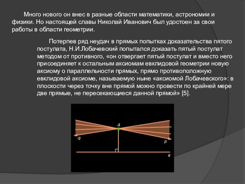 Потерпев ряд неудач в прямых попытках доказательства пятого постулата, Н.И.Лобачевский попытался доказать пятый постулат методом от противного, «он отвергает пятый постулат и вместо него присоединяет к остальным аксиомам евклидовой геометрии новую аксиому о параллельности прямых, прямо противоположную евклидовой аксиоме, называемую ныне «аксиомой Лобачевского»: в плоскости через точку вне прямой можно провести по крайней мере две прямые, не пересекающиеся данной прямой» [5].