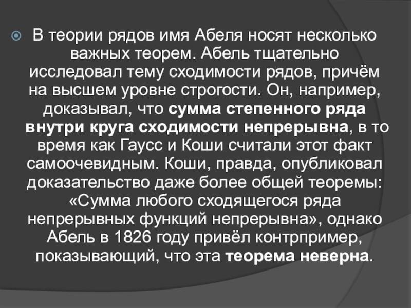 исследовал тему сходимости рядов, причём на высшем уровне строгости. Он, например, доказывал, что сумма степенного ряда внутри круга сходимости непрерывна, в то время как Гаусс и Коши считали этот факт самоочевидным. Коши, правда, опубликовал доказательство даже более общей теоремы: «Сумма любого сходящегося ряда непрерывных функций непрерывна», однако Абель в 1826 году привёл контрпример, показывающий, что эта теорема неверна.