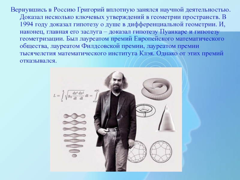 утверждений в геометрии пространств. В 1994 году доказал гипотезу о душе в дифференциальной геометрии. И, наконец, главная его заслуга – доказал гипотезу Пуанкаре и гипотезу геометризации. Был лауреатом премий Европейского математического общества, лауреатом Филдсовской премии, лауреатом премии тысячелетия математического института Клэя. Однако от этих премий отказывался.
