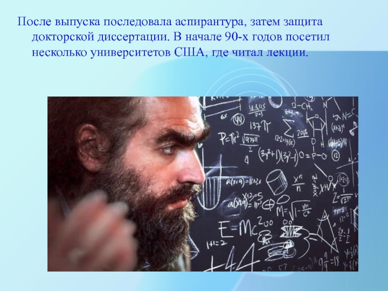 Слайд 5После выпуска последовала аспирантура, затем защита докторской диссертации. В начале 90-х