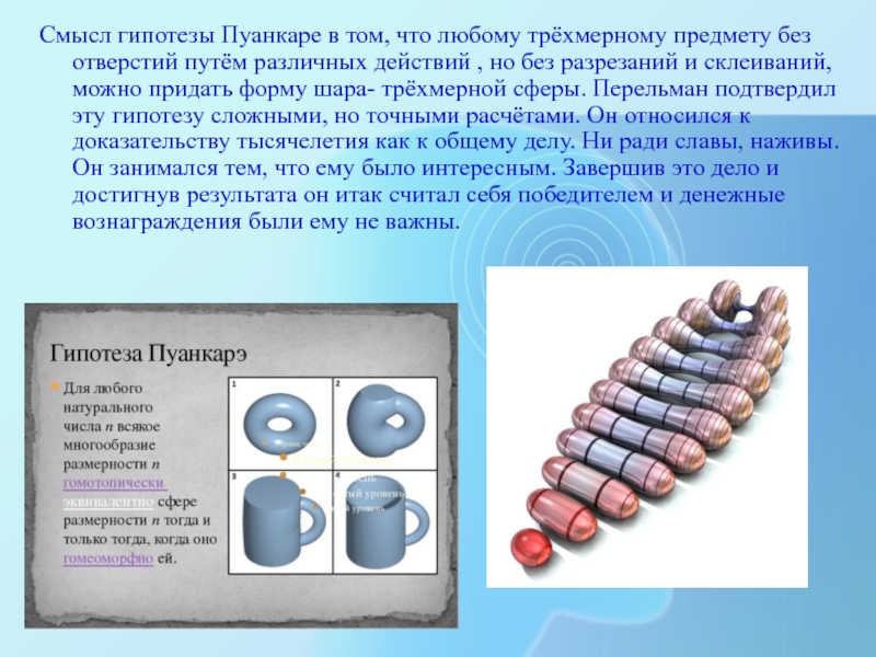 путём различных действий , но без разрезаний и склеиваний, можно придать форму шара- трёхмерной сферы. Перельман подтвердил эту гипотезу сложными, но точными расчётами. Он относился к доказательству тысячелетия как к общему делу. Ни ради славы, наживы. Он занимался тем, что ему было интересным. Завершив это дело и достигнув результата он итак считал себя победителем и денежные вознаграждения были ему не важны.