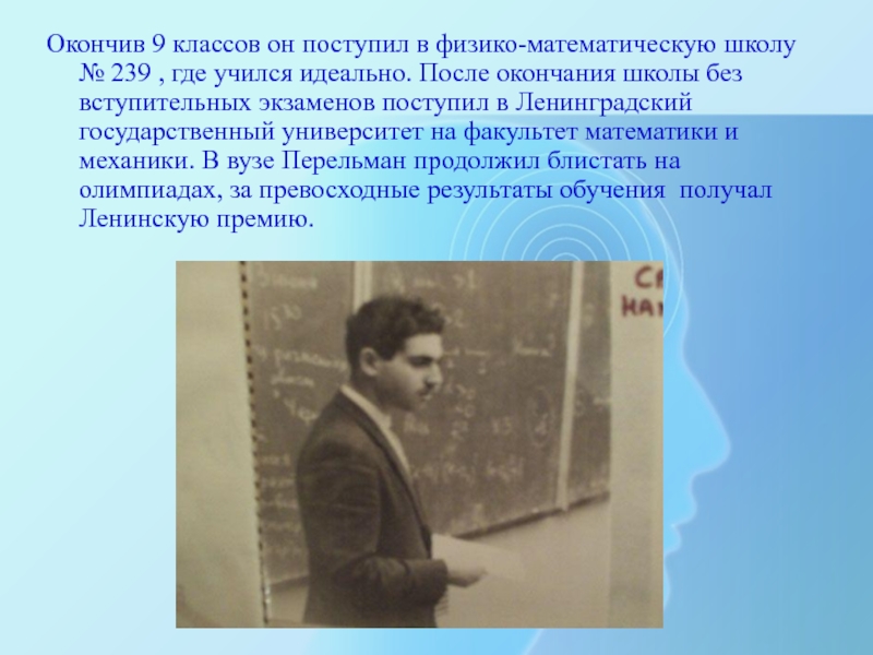 Слайд 4Окончив 9 классов он поступил в физико-математическую школу № 239 ,