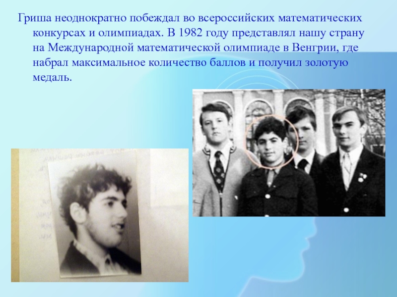 Слайд 3Гриша неоднократно побеждал во всероссийских математических конкурсах и олимпиадах. В 1982
