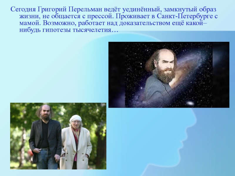 Слайд 8Сегодня Григорий Перельман ведёт уединённый, замкнутый образ жизни, не общается с