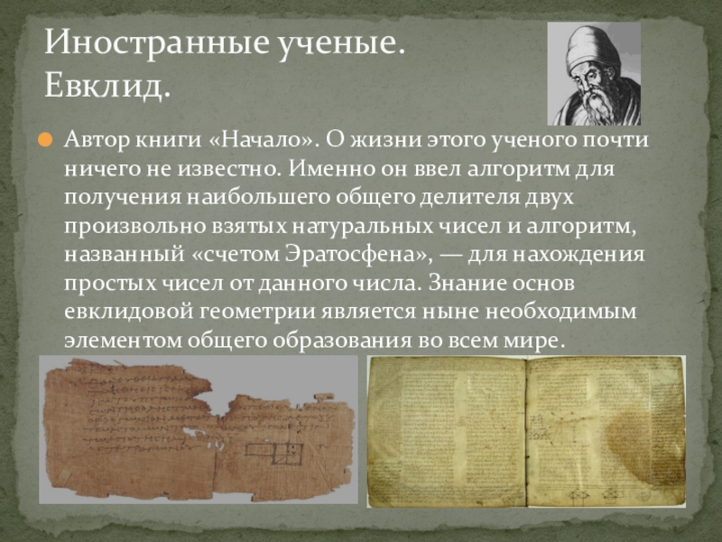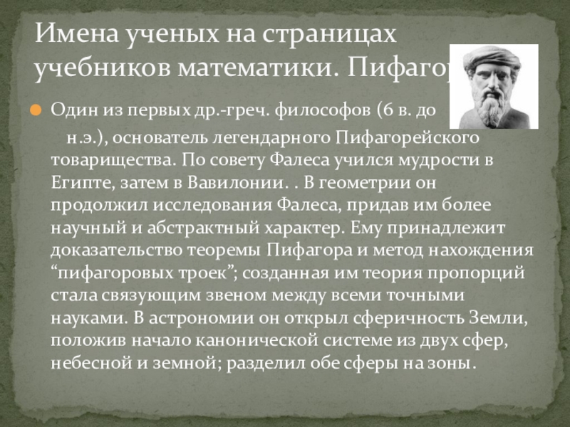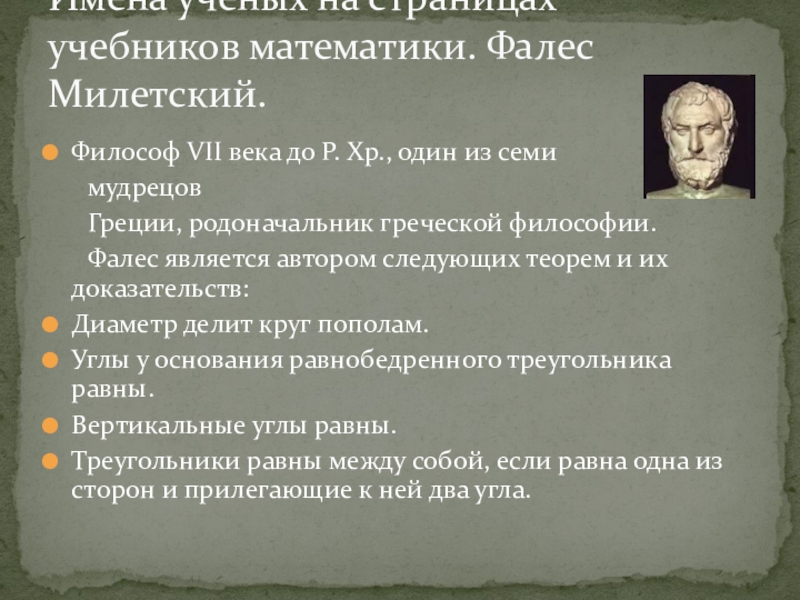 Имена ученых на страницах учебников математики. Фалес Милетский.