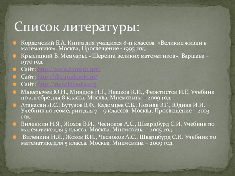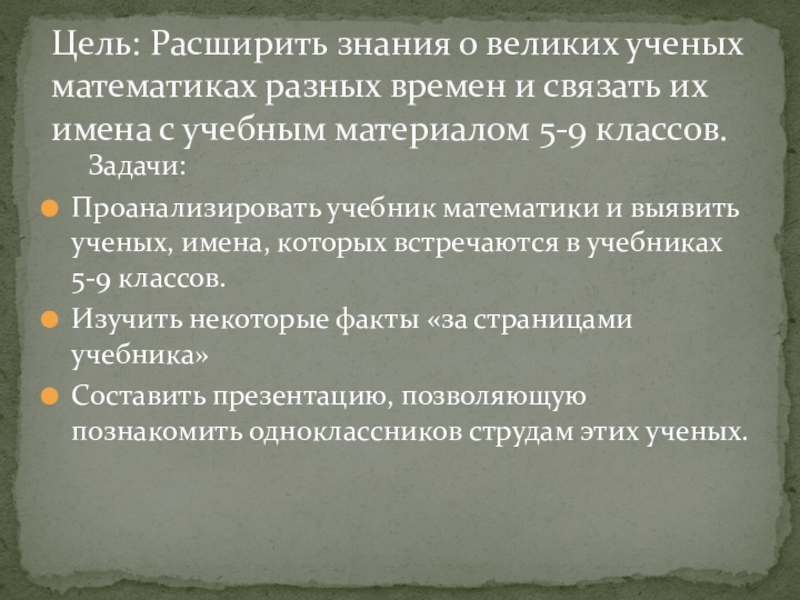 Цель: Расширить знания о великих ученых математиках разных времен и связать их имена с учебным материалом 5-9 классов.