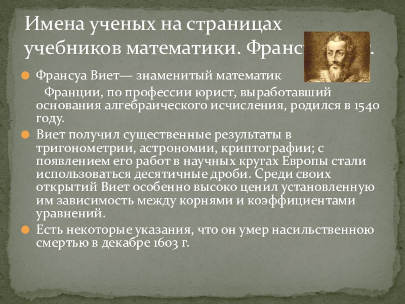 Имена ученых на страницах учебников математики. Франсуа Виет.