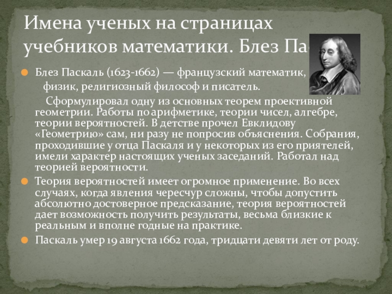 Имена ученых на страницах учебников математики. Блез Паскаль.