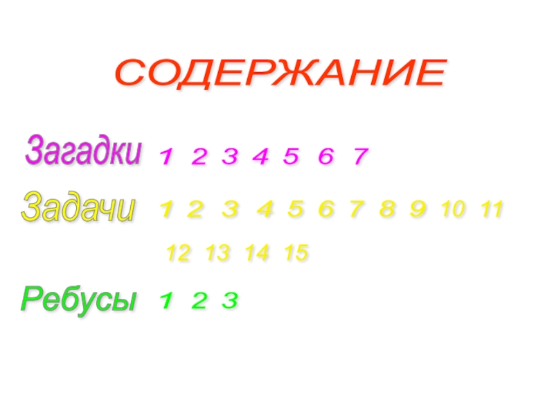 СОДЕРЖАНИЕ Загадки Задачи Ребусы 1 1 2 3 4 5 6 7 8 9 10 1 2 3 11 12 2 3 4 5 6 7 13 14 15