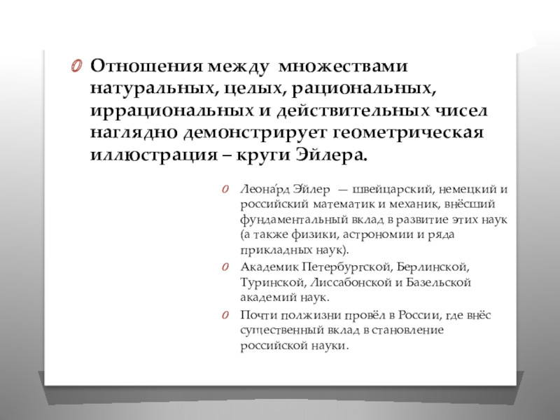 Леона́рд Э́йлер — швейцарский, немецкий и российский математик и механик, внёсший фундаментальный вклад в развитие этих наук (а также физики, астрономии и ряда прикладных наук).